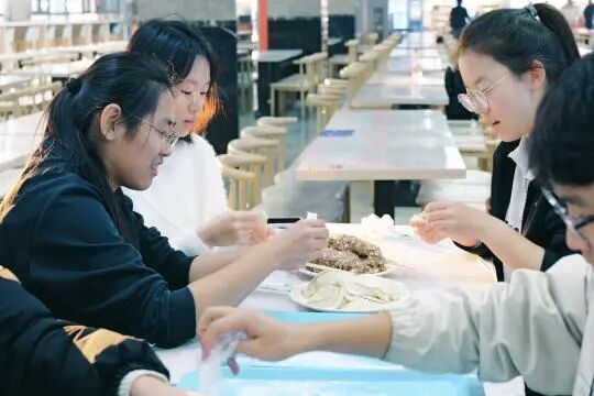 巧手翻飞,各显神通。16:30,师生们陆续来到餐厅,在工作人员的引导下有序就座,现场气氛热烈。同学们分工协作,撒面粉,包馅料,整理摆盘,动作娴熟,配合默契。来自五湖四海的同学们展示了各地不同的包饺子手法,月牙饺、元宝饺、波纹饺、小笼包等造型各异的饺子相继呈现。许多第一次包饺子的同学在老师和同学的指导下,也包出了有模有样的饺子,脸上洋溢着自豪的笑容。