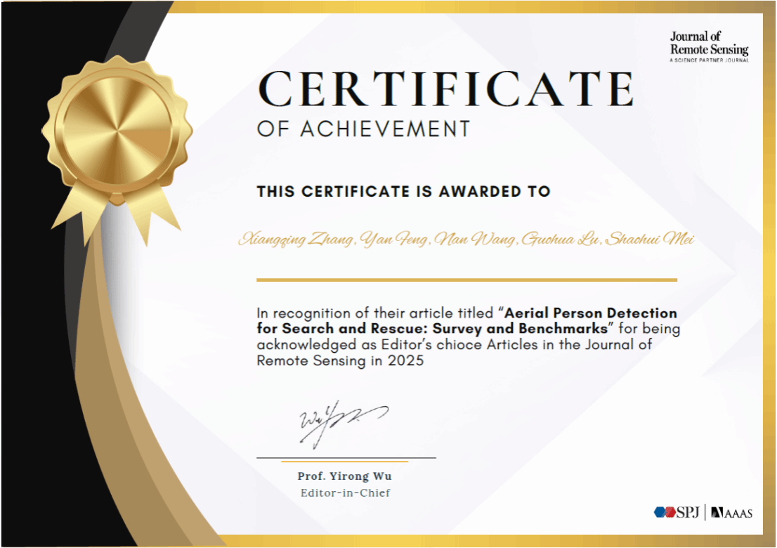 近日,遥感领域高水平期刊《Journal of Remote Sensing》(中文名《国际遥感学报》)公布了2025年度“主编推荐文章”(Editor's Choice Articles)名单。英国上市公司官网365英国上市公司官网365梅少辉教授团队发表的综述论文“Aerial Person Detection for Search and Rescue: Survey and Benchmarks”(面向航空搜救的人员弱小目标检测方法研究:综述及测评基准)成功入选。